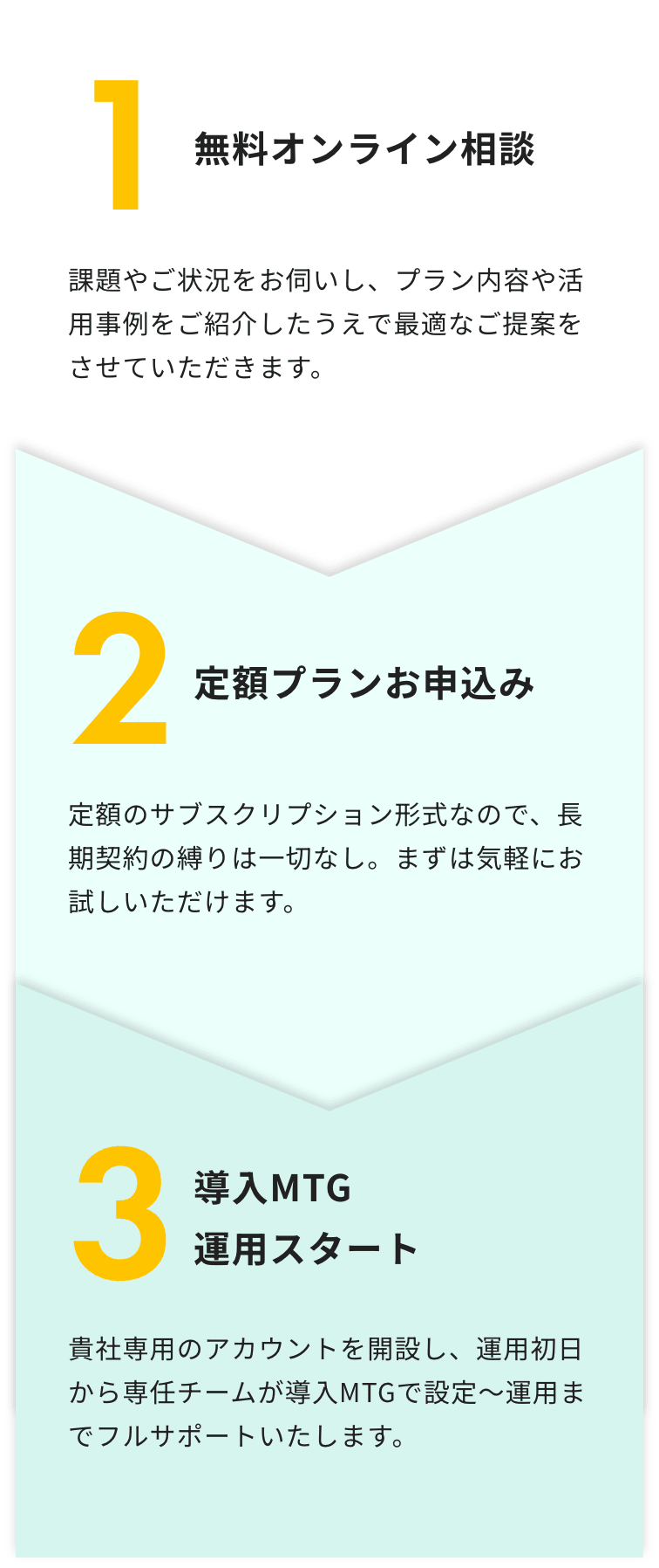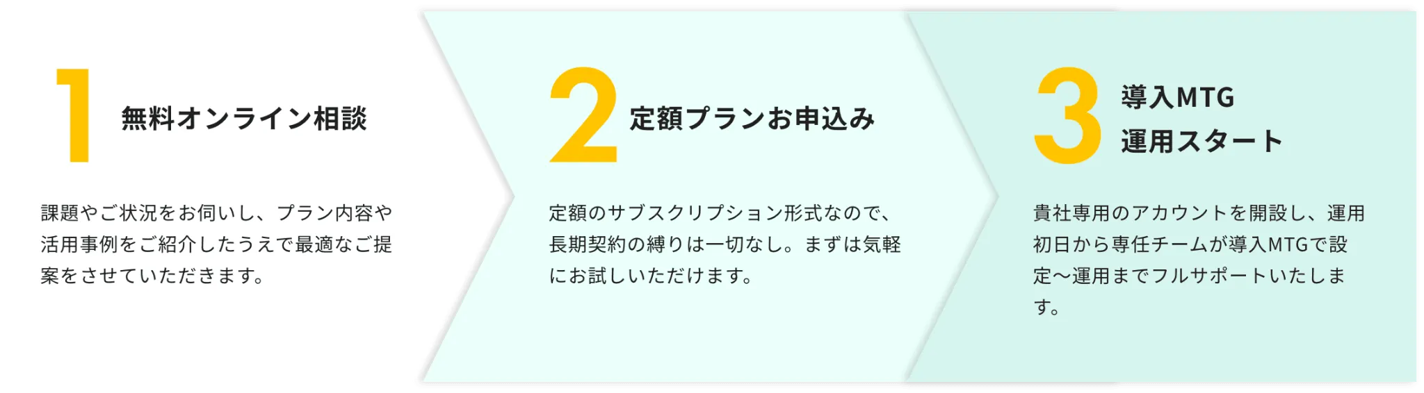 「社内でフルタイムの専門家を雇うほど予算がない…」という企業も安心。定額プラン内で今必要な知見やノウハウを、コストを抑えながら必要な分だけ柔軟に活用していくことが可能です。