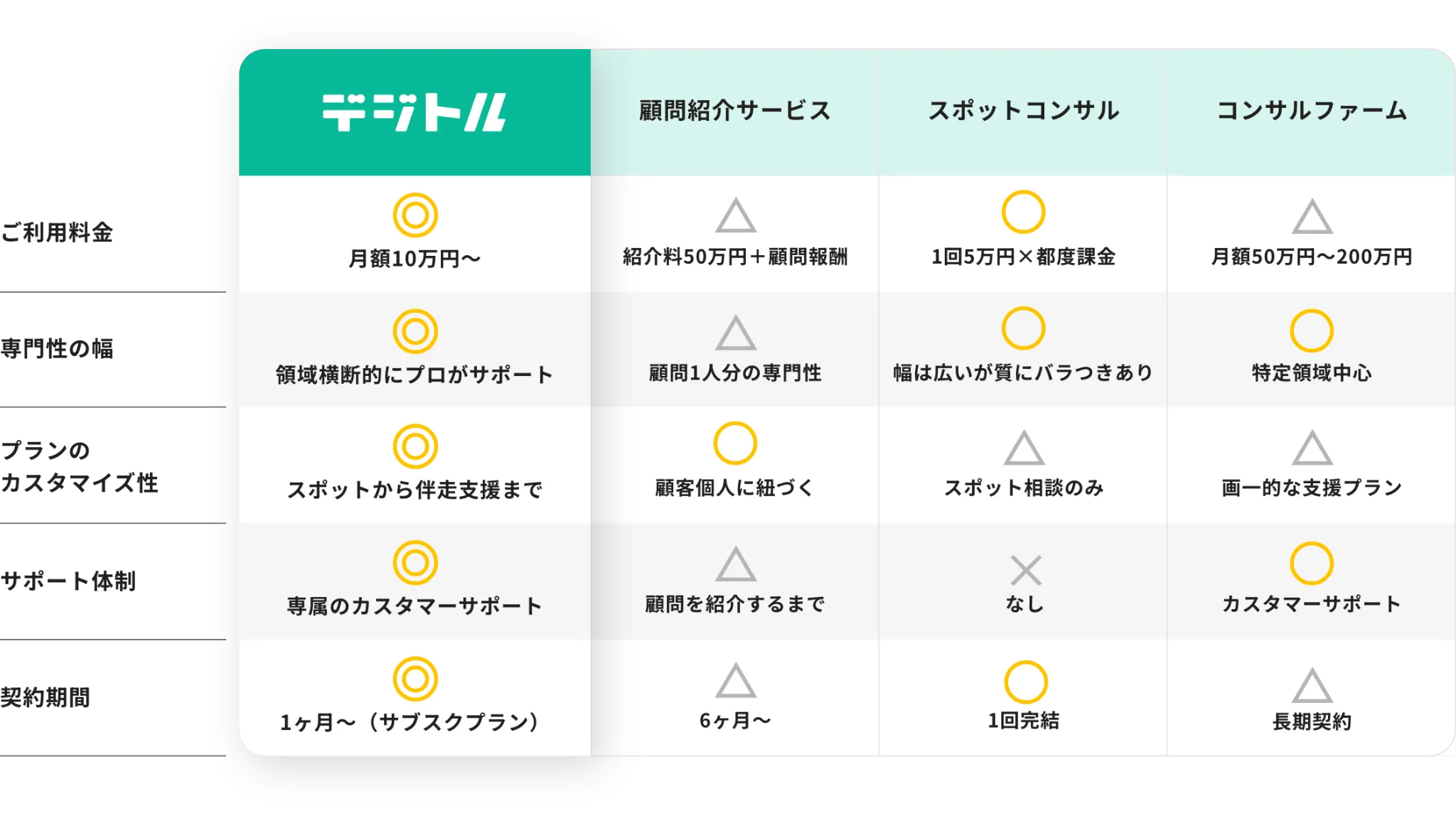 社内で専任人材を抱えるより、大幅なコストダウンが可能です。マーケ・エンジニア・HRなど、複数の専門領域をまとめてカバーできるので、スピード感を持って課題を解決できる社内体制を短期間で整えられます。