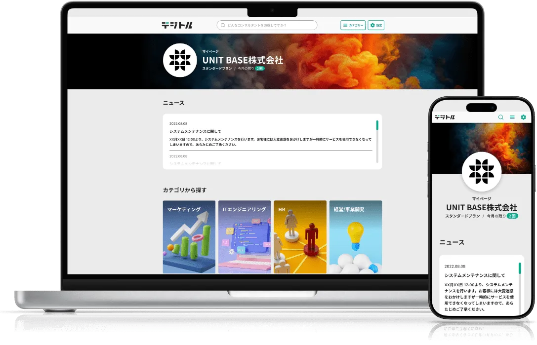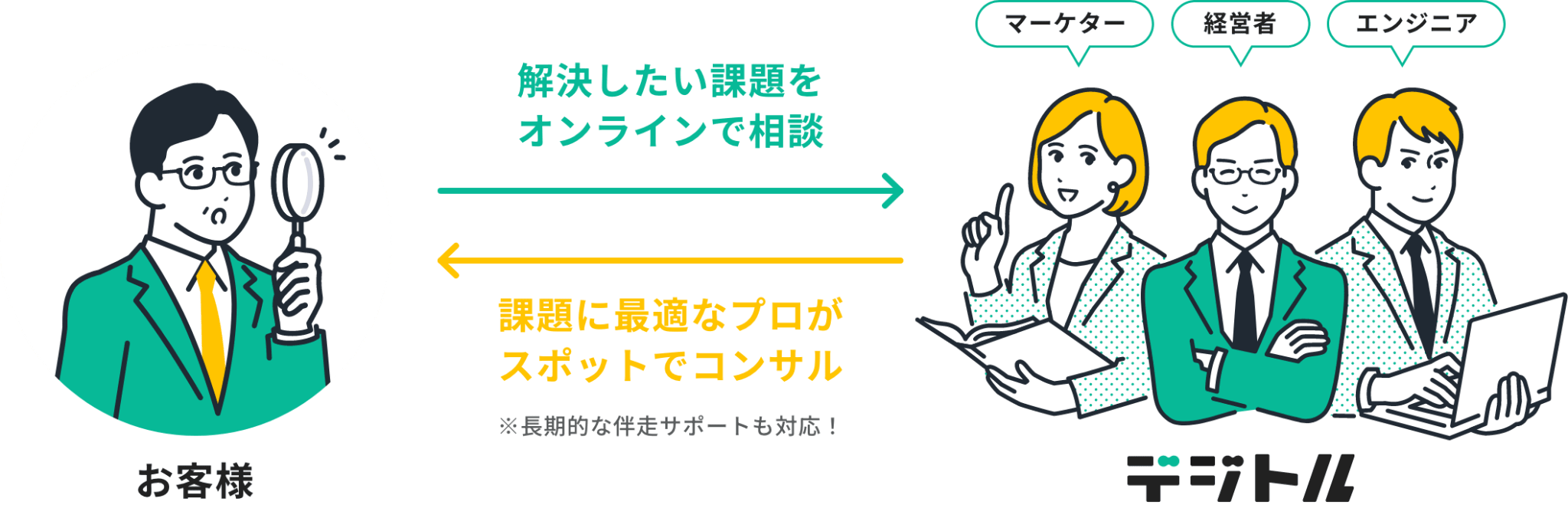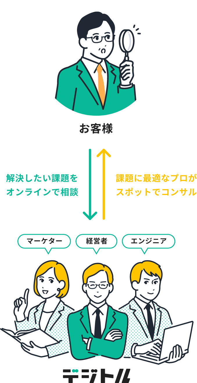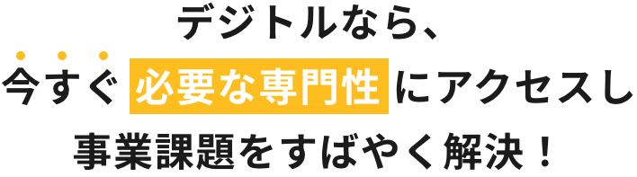 面倒な手続きを徹底的に省いた、デジトル独自のオンラインシステム。最短2日でマッチングし、必要なときだけ専門家の力を借りられます。